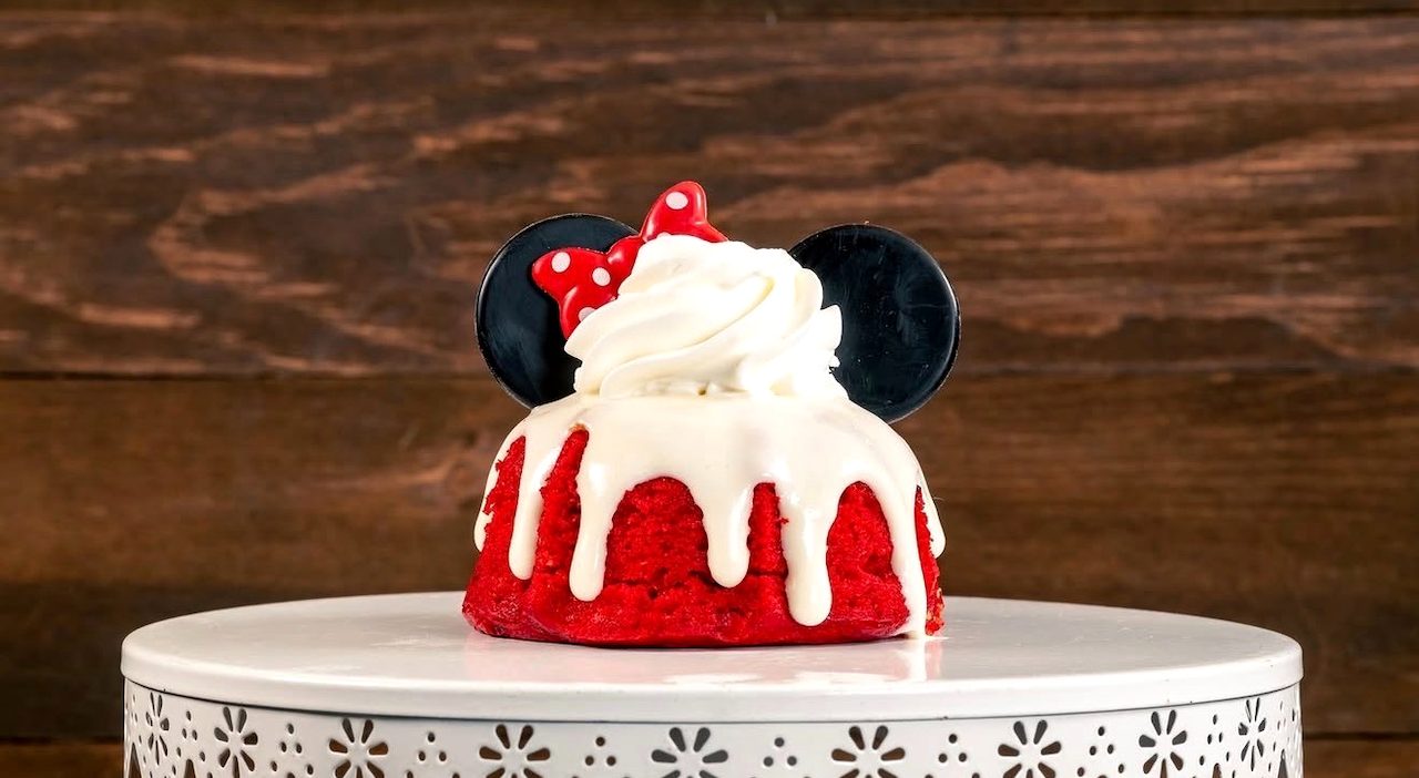 Possibly the cutest item on the list. A strawberry Bundt cake filled with jam and fresh berries, topped with glaze, white chocolate mousse, and a Minnie-inspired design that’s almost too pretty to eat.